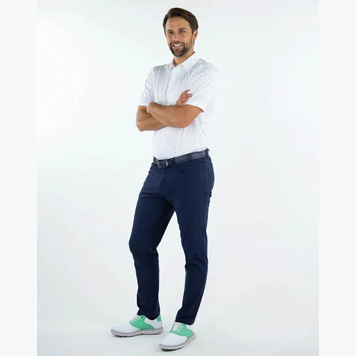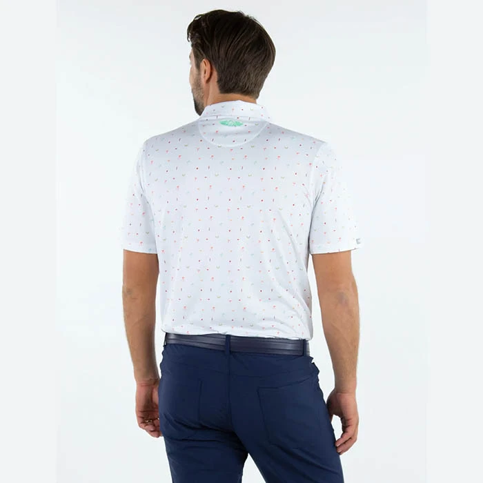 The Key Largo Polo is covered in a tropical theme print consisting of palm trees, parrots, bananas…and more! Made from performance pin dot jersey.